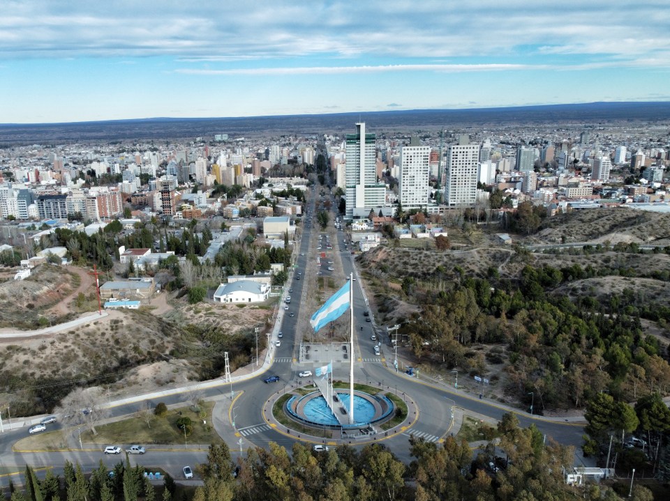 La Avenida Argentina se extiende como una arteria principal que conecta diferentes sectores de la ciudad. En la imagen aérea, la avenida se muestra como una calle ancha y bien mantenida, flanqueada por aceras amplias y árboles que brindan sombra y frescura. A lo largo de la avenida, se pueden ver comercios, oficinas y edificios residenciales que le dan vida a la zona. Los edificios de la ciudad de Neuquén se distribuyen a lo largo de la avenida y alrededor de la Plaza de las Banderas.