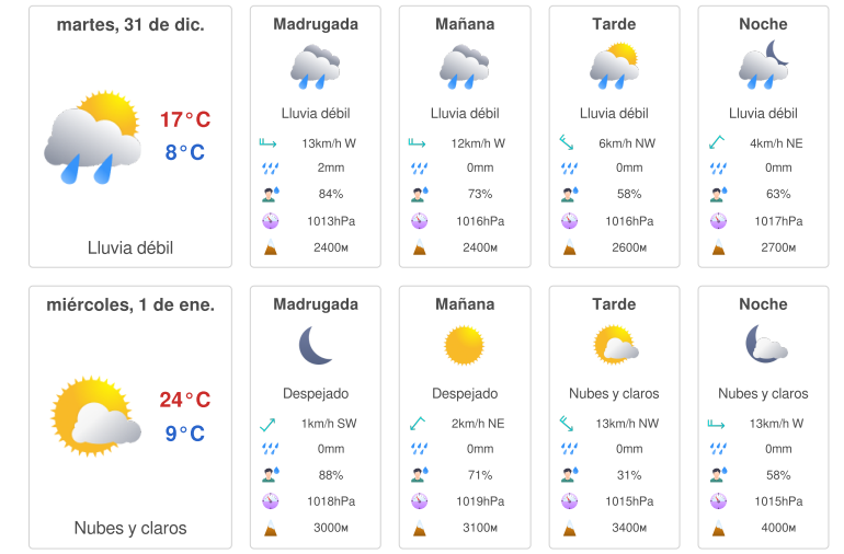 Para el 1 de enero del 2025 las temperaturas se elevarán hasta rozar los 30°C con mínimas de 14°C. El cielo estará despejado durante toda la jornada y no habrá lluvias ni vientos, según el sitio Meteored.