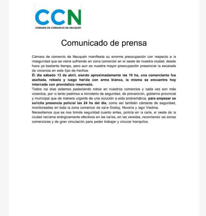 Desde la CCN lanzaron un comunicado de prensa manifestando su «enorme preocupación con respecto a la inseguridad que se viene sufriendo en zona comercial en el oeste» de la ciudad.