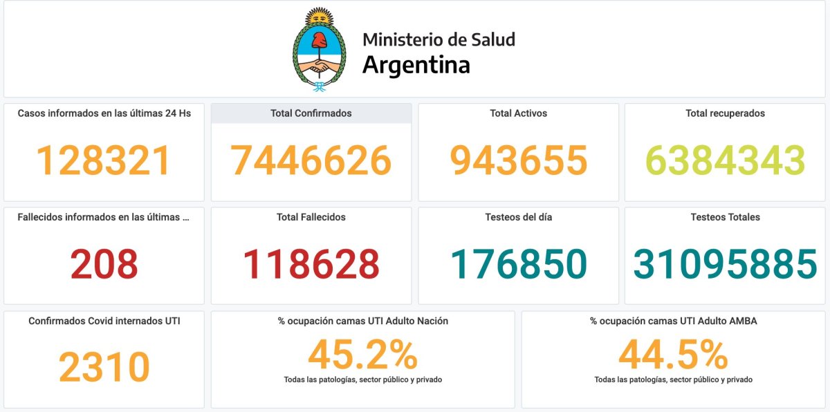 Otras 208 personas murieron y 128.321 fueron reportadas con coronavirus en las últimas 24 horas en la Argentina, con lo que suman 118.628 los fallecidos registrados oficialmente a nivel nacional y 7.446.626 los contagiados desde el inicio de la pandemia, informó hoy el Ministerio de Salud.