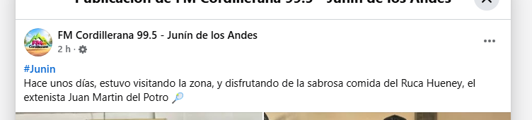 En las últimas horas, desde FM Cordillerana 99.5 de Junín de los Andes se viralizó una publicación en redes sociales que asegura que el ex tenista Juan Martín del Potro estuvo de visita en la zona y disfrutó de la tradicional comida del Ruca Hueneey acompañado de asados y platos típicos de la región.