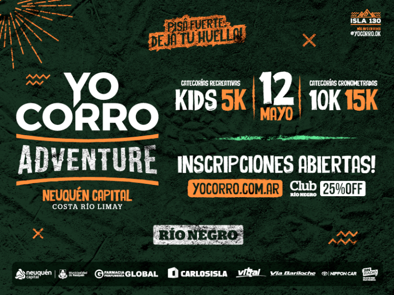 «Yo Corro Adventure» es organizado por Editorial RÍO NEGRO y cuenta con el acompañamiento de: Municipalidad de Neuquén, Carlos Isla, Pan American Energy, Farmacia y Perfumería Global, Vittal, Sancor Seguros, Via Bariloche, Alquimia Kinesio, Nippon Car y Río Negro Radio.