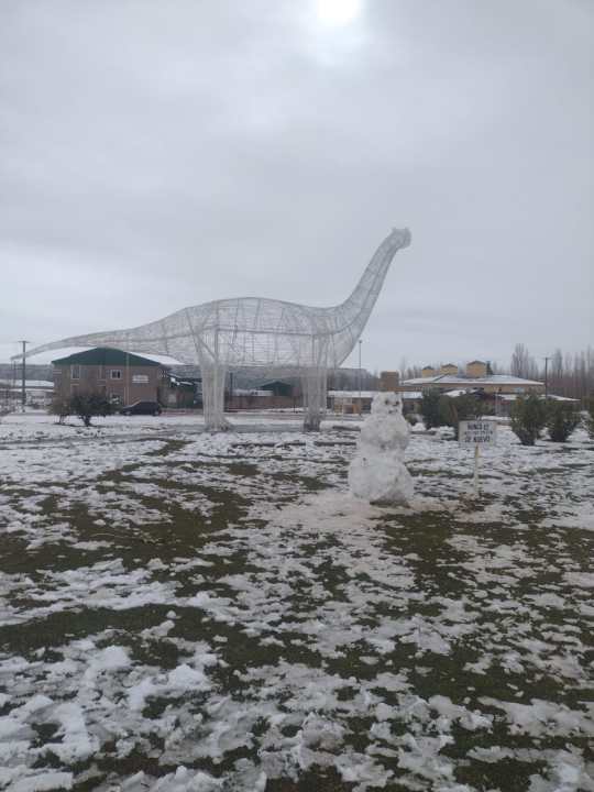 Algunas de las postales, muestra a la escultura metálica de un dinosaurio herbívoro, ubicada en el acceso a la ciudad, rodeado de blanco. También en las letras, que dan la bienvenida a la localidad.