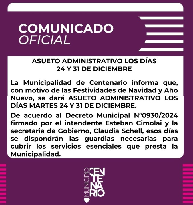 «Esos días se dispondrá de guardias necesaria para cubrir los servicios esenciales que presta la municipalidad», difundieron. El decreto lleva la firma del intendente Esteban Cimolai y la secretaria de Gobierno, Claudia Schell.