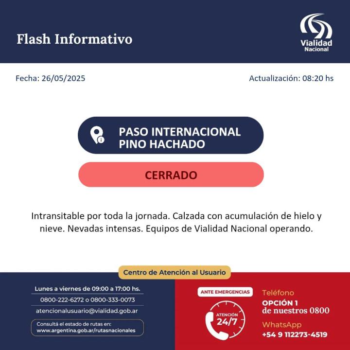 Según informaron desde Vialidad Nacional, el Paso Internacional Pino Hachado estuvo cerrado este lunes 26 de mayo.