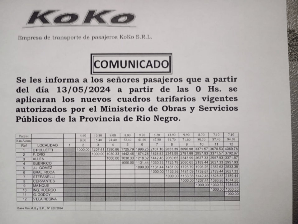 «Se les informa a los señores pasajeros que el 13 de mayo, a partir de las 00 horas se aplicarán los nuevos cuadros tarifarios vigentes autorizados por el Ministerio de Obras y Servicios Públicos de Río Negro», dijeron desde la firma.
