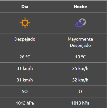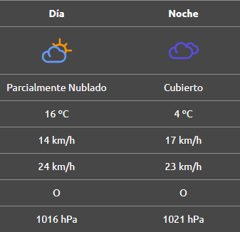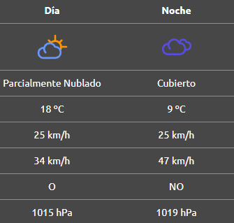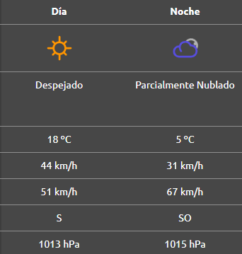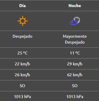Por la noche la mínima será de 5°C, mientras que el viento cambiará de dirección hacia el sudoeste a casi 70 km/h.