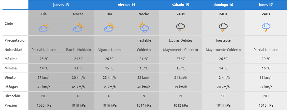 El miércoles el pronóstico será similar: máxima de 24, tiempo nublado y ráfagas que rondarán los 34 km/h entre la tarde y noche. Por otra parte, el viernes la temperatura ascenderá: la máxima será de 29°. Durante el viernes y sábado habrá tiempo inestable.