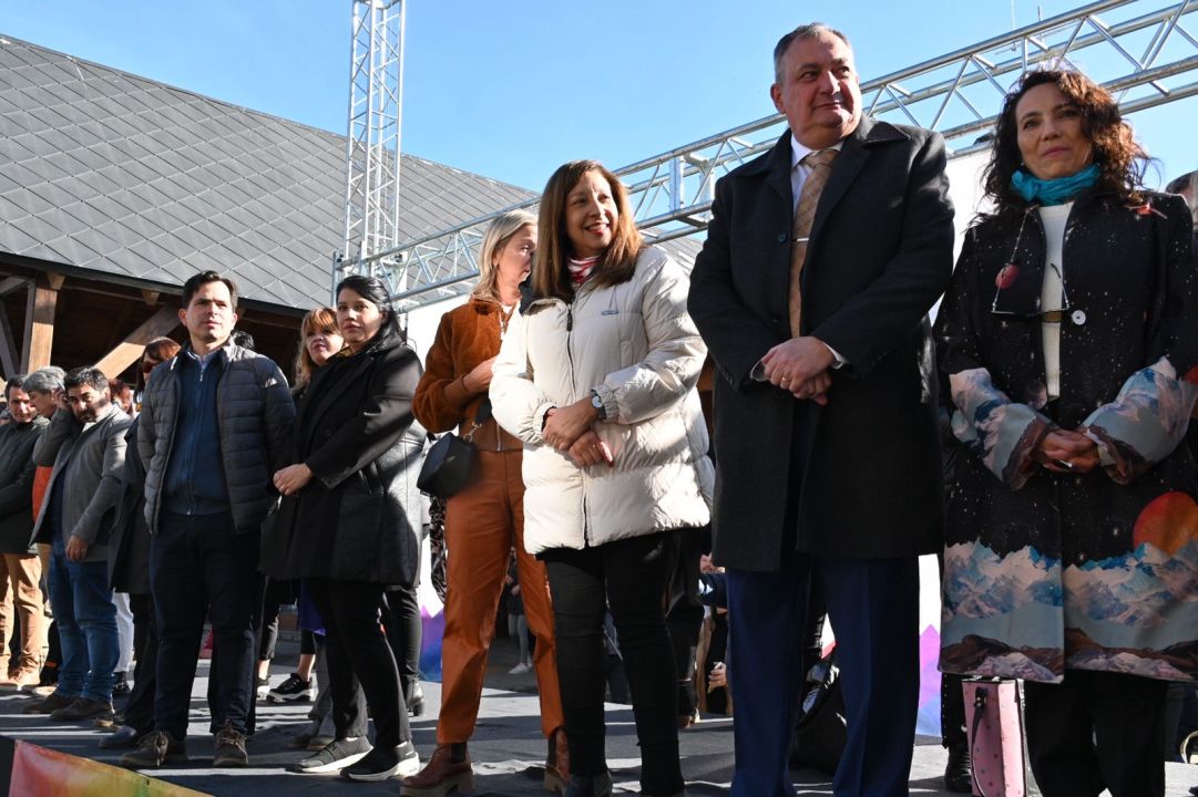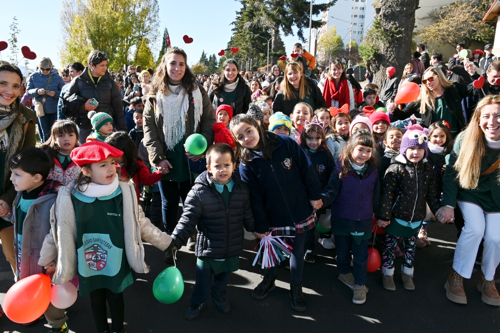 En una mañana fría pero soleada, la principal actividad del Aniversario de Bariloche se concentró en la avenida Juan Manuel de Rosas, con el algo Nahuel Huapi a sus pies, y un palco de autoridades instalado en el Puerto San Carlos donde también acompañó con su música la Banda de la Escuela Militar de Montaña.