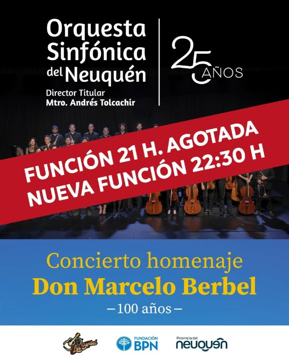 En el marco del 25° aniversario de la Orquesta Sinfónica de Neuquén y del centenario del natalicio de Marcelo Berbel, se viene este viernes 25 la siguiente fecha dentro del calendario de festejos. Si bien al principio se trataba de una sola función, a las 21 horas, este miércoles anunciaron una segunda a las 22.30, a causa de la gran convocatoria.