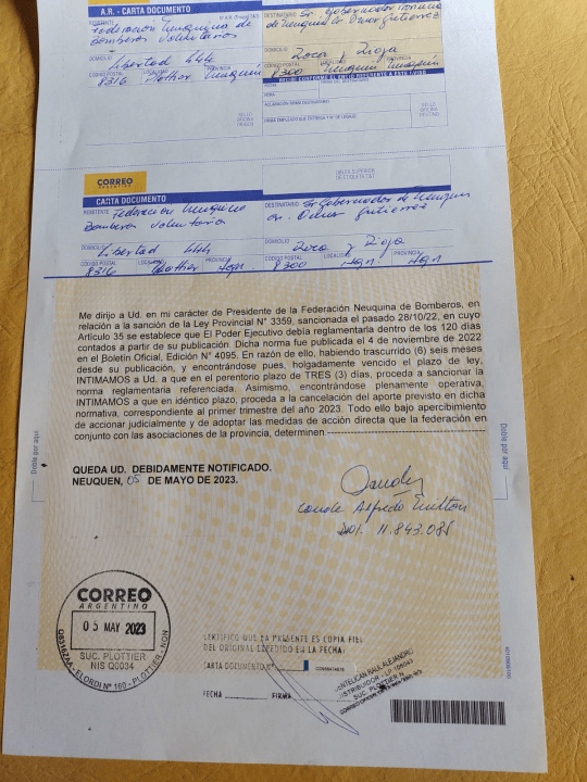 La Federación Neuquina de Bomberos intimó este viernes, por medio de una carta documento, al gobernador de Neuquén, Omar Gutiérrez. El documento está firmado por el presidente de la organización Milton Canale.