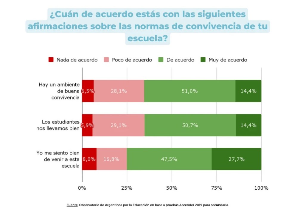 El 34,6% de los estudiantes del último año de secundaria están “nada” o “poco” de acuerdo con la afirmación de que hay buen clima de convivencia en su escuela. Por otro lado, el 65,4% percibe un buen ambiente de convivencia escolar. La mayoría de los estudiantes (75,2%) dice sentirse bien al ir a su escuela, mientras que 1 de cada 4 (24,8%) está en desacuerdo con esta idea.