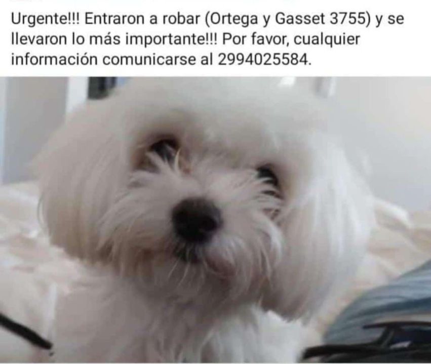 Una vecina de la ciudad compartió en redes sociales que sufrió un robo en su casa y que además de objetos se llevaron a su perra. El trágico episodio ocurrió sobre Ortega y Gasset a muy pocos metros de Moritán.