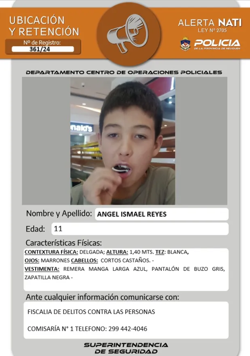La Policía de Neuquén lanzó este domingo un operativo de búsqueda y retención para Ángel Ismael Reyes, un niño de 11 años de la capital neuquina.