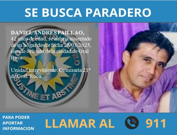 De acuerdo a información a la que pudo acceder Diario RÍO NEGRO, pasado el mediodía de este martes, cerca de las 13, el comisario de la unidad policial 21 de Roca se hizo presente en la Unidad Regional II de la ciudad. Fue acompañado por dos efectivos, con el fin de realizar averiguaciones pertinentes sobre Daniel Andrés Paillao, que se encuentra desaparecido desde aproximadamente las 17 del viernes 28 de marzo.