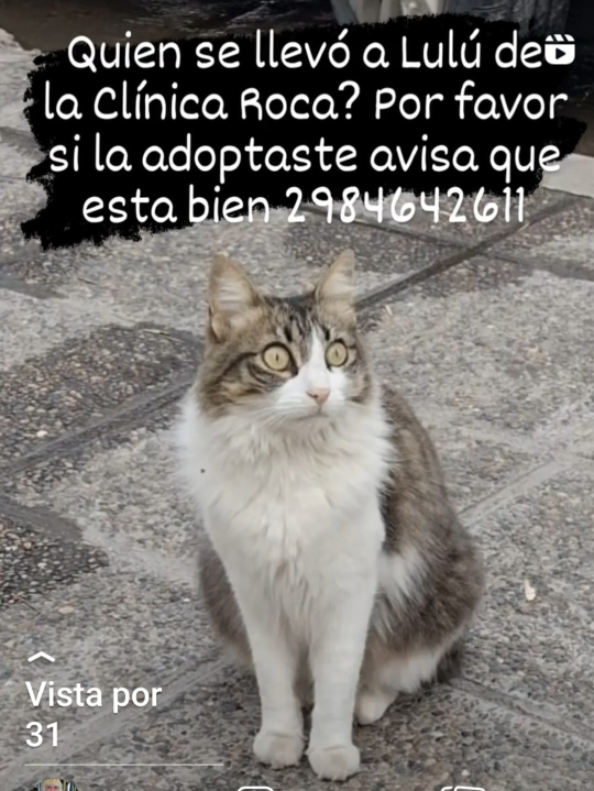 Personal de una clínica en Roca comenzó la búsqueda desesperada de "Lulu", una gatita que siempre se encuentra afuera del edificio y brinda amor a los pacientes. Aseguraron que la vieron por última vez el sábado 8 y desde entonces no la volvieron a ver por la zona. La comunidad se unió en una misión para encontrar a la mascota y asegurarse sobre el bienestar del animal.