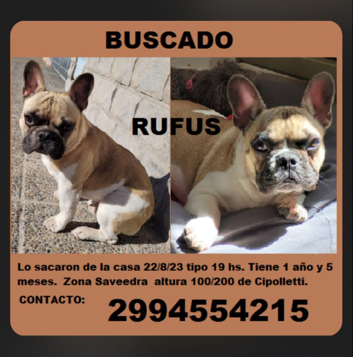Explicó que Rufus es un Bulldog francés de un año y cinco meses, entre sus características planteó que cuando camina o corre, sus patas traseras tienen un leve desvío que lo hace identificable.