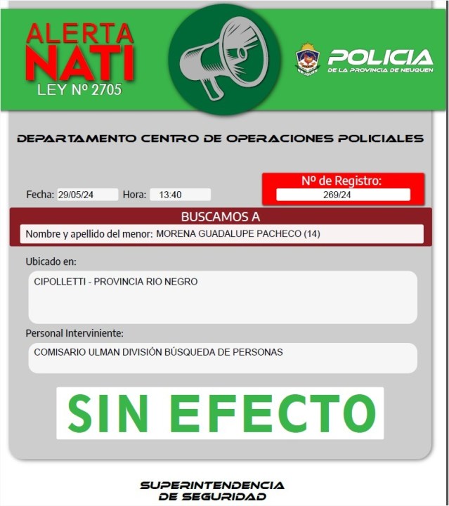 Luego de varios días de búsqueda, este miércoles la Policía emitió otro comunicado avisando que la adolescente fue encontrada en buen estado de salud, en la ciudad de Cipolletti. De esta manera desactivaron oficialmente el pedido de búsqueda.