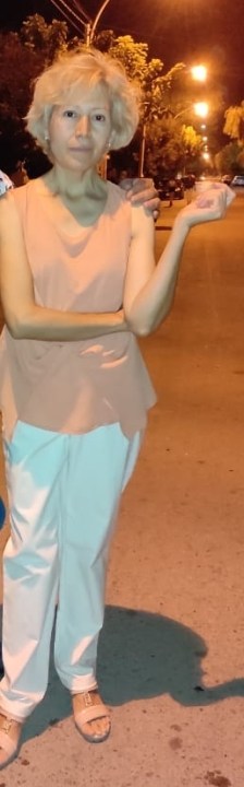 La mujer es de contextura física delgada, mide aproximadamente 1,60 metros, tez blanca, ojos color marrones, pelo color rubio claro como platinado y ondulado debajo de los hombros.