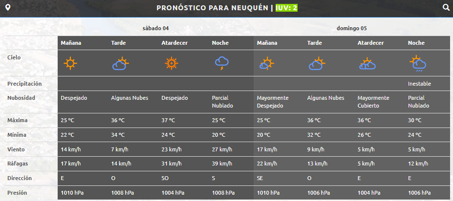 Para la capital de Neuquén y zonas aledañas las temperaturas oscilarán este sábado entre los 17°C y los 36°C. Estas temperaturas se mantendrán hasta el inicio de la semana próxima. Además, se espera que caigan fuertes tormentas.