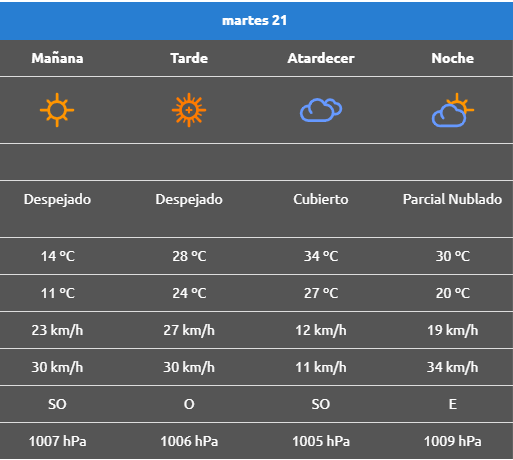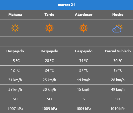 Este martes se anuncia una jornada de calor extremo con una mínima de 18°C en la mañana y máximas de hasta 34°C en la tarde. Se prevé una jornada vetosa, con velocidades constantes de entre 14 y 31 kilómetros por hora.