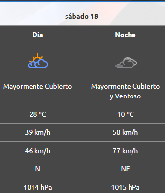 Por la noche la mínima será de 10°C y estará mayormente cubierto y ventoso, ya que desde el noreste llegarán ráfagas de casi 80 km/h.