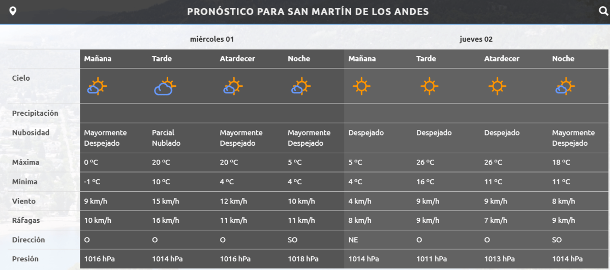 Este miércoles 1 de enero promete una jornada agradable para San Martín de los Andes, sin viento ni lluvias en la cordillera de Neuquén. Las ráfagas más fuertes podrían llegar a la tarde, pero no superarán los 16 kilómetros por hora.