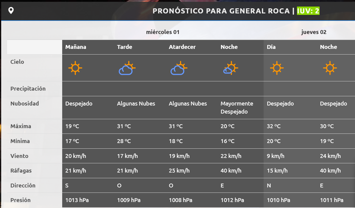 En Viedma, si bien en un principio se anunciaban lluvias para este miércoles 1 de enero, la AIC actualizó el clima. Para este Año Nuevo sí se pronostica viento con ráfagas constantes que rondarán los 30 kilómetros por hora. Las más fuertes se sentirán en la tarde: podrían superar los 54 kilómentros por hora.