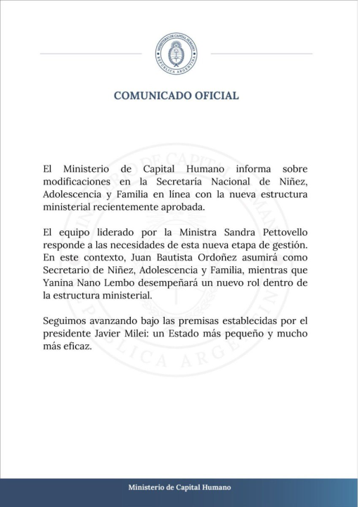 «El equipo liderado por la ministra Sandra Pettovello responde a las necesidades de esta nueva etapa de gestión. En este contexto, Juan Bautista Ordoñez asumirá como secretario de Niñez, Adolescencia y Familia, mientras que Yanina Nano Lembo desempeñará un nuevo rol dentro de la estructura ministerial», indicaron desde el Ministerio de Capital Humano.