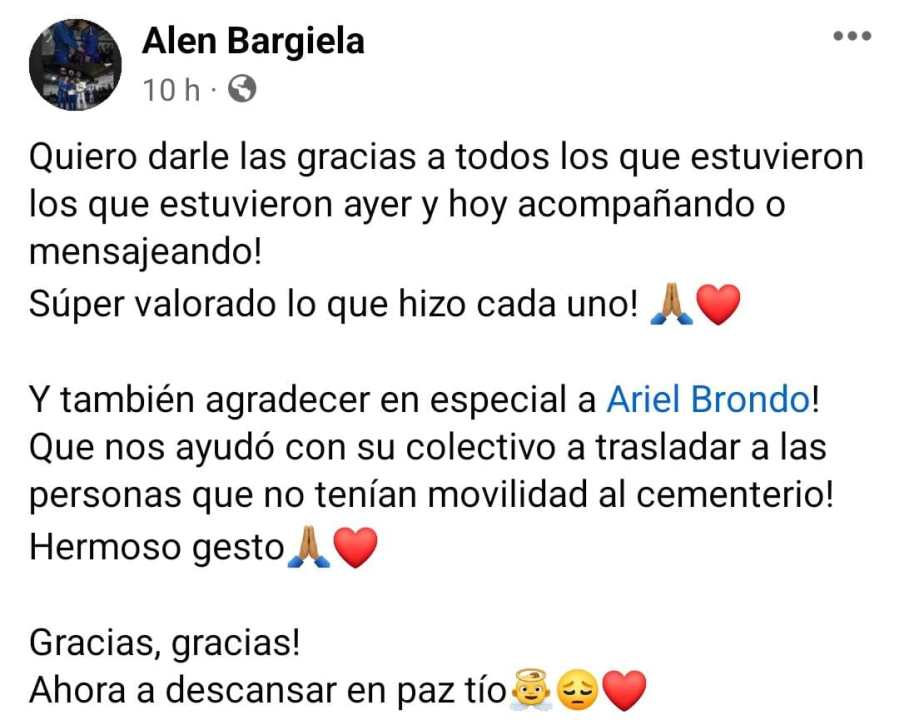 A través de un posteo en Facebook, Alen Bargiela, uno de los sobrinos de Facundo, agradeció que una de las personas «ayudó con su colectivo a trasladar a las personas que no tenían movilidad al cementerio».