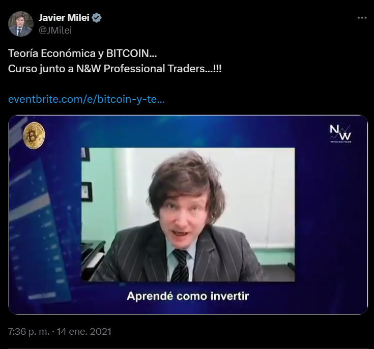 «¿Estás interesado invertir en Bitcoin? Bueno, para invertir lo tenés que hacer como un profesional. Por eso, con la gente de N&W Professional Traders este 29 de enero vamos a hacer un curso sobre teoría económica, bitcoins y, sobre todas las cosas, sobre mercados. No te la podés perder: aprendé cómo invertir en el activo más importante del 2020«, decía el libertario en ese entonces en sus redes sociales.
