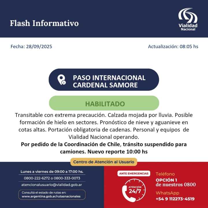 En tanto, otro de los cruces muy usados, el paso Cardenal Samoré, está habilitado. «Transitable con extrema precaución. Calzada mojada por lluvia», informaron desde vialidad.