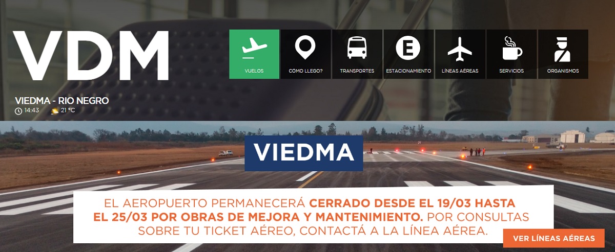La Administración Nacional de Avión Civil (ANAC) informó que el aeropuerto Gobernador Castello de Viedma permanecerá cerrado por siete días, luego de que se aprobaran los planes de mantenimiento presentados por la empresa Aeropuertos Argentina 2000.