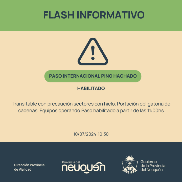 El paso fronterizo Pino Hachado se encuentra habilitado con precaución por el resto de este martes por las condiciones en las que se encuentra la ruta que une Neuquén con Chile. «Equipos operando, paso habilitado a partir de las 11», indicó Vialidad de Neuquén.