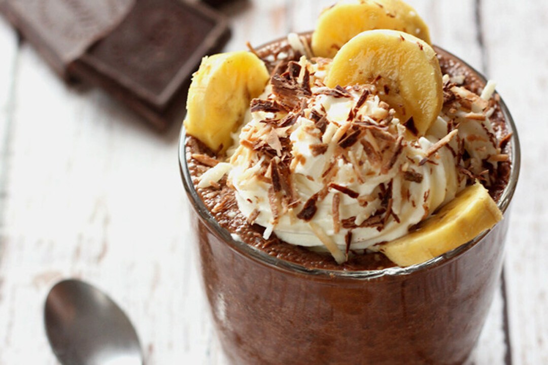 Leche descremada, agua o bebida vegetal, 3 cdas soperas al ras de semillas de chia, 1 tapita de esencia de vainilla, 1 cuchara de cacao amargo en polvo, canela, 1 puñado chico de pasas de uva previamente hidratadas o 2 ciruelas
