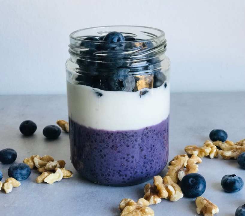 Procedimiento: mezclar todo. Dejar 1 hora en heladera hasta que tome consistencia y formar el postre con capas. Por ej: una de mermelada de arándanos natural que se hace al hervir 1 taza de arándanos con un poquito de agua y stevia. Una vez frio se agrega al pudding y listo.