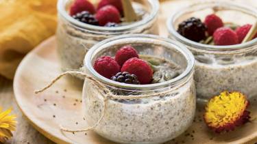 40 grs de semillas de chia, 165 cc taza de leche de almendra o descremada, 1 cda de miel, 1 cdita de de extracto de vainilla. Fruta fresca, granola, mermelada de frambuesa