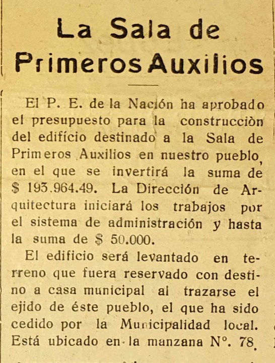Con el tiempo llegó la mejor noticia: «El Poder Ejecutivo de la Nación ha aprobado el presupuesto para la construcción del edificio destinado a la Sala de Primeros Auxilios en nuestro pueblo, en el que se invertirá la suma de $193.964,49”, anunció un recuadro de la edición de “El Mentor”, el diario local, en la mañana del 24 de mayo de 1939. “La Dirección de Arquitectura”, ampliaba el medio gráfico, “iniciará los trabajos por el sistema de administración y hasta la suma de $50.000. El edificio será levantado en terreno que fuera reservado con destino a casa municipal, al trazarse el ejido municipal de éste pueblo, el que ha sido cedido por la Municipalidad local. Está ubicado en la manzana N°78”.