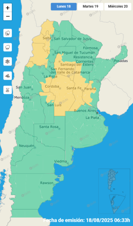 Las malas condiciones del clima regresan este lunes 18 de agosto, en diferentes zonas del país, por lo que el Servicio Meteorológico Nacional (SMN) renovó el alerta por tormentas fuertes con posible caída de granizo y ráfagas. De esta manera, el SMN mantenía un alerta amarillo que rige este lunes para zonas de San Luis, La Rioja, Córdoba, Santiago del Estero, San Luis y Entre Ríos.