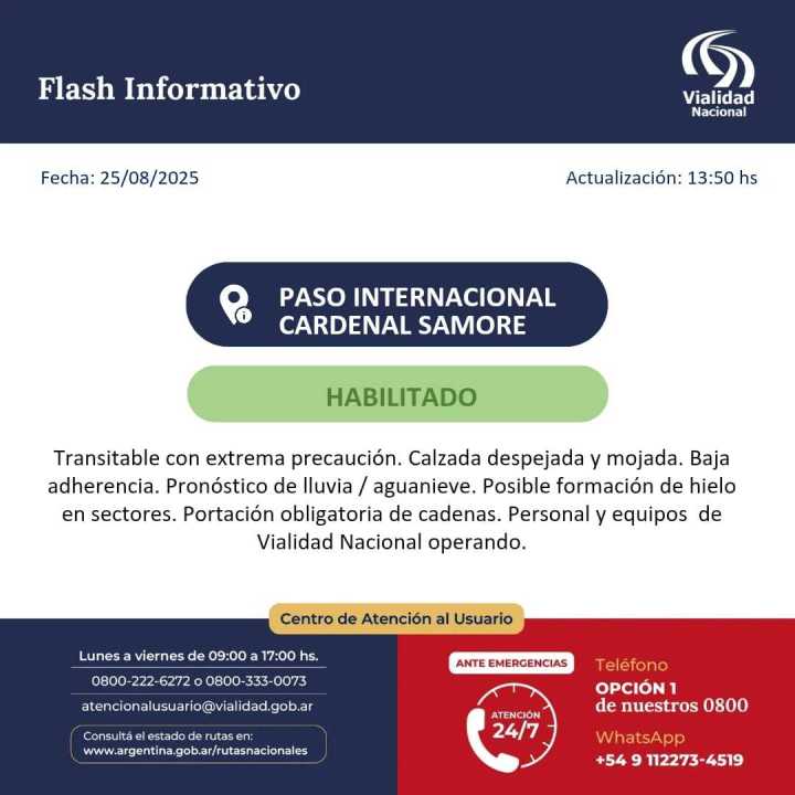La última actualización, emitida a las 10 indica que el paso está habilitado para la circulación. Sin embargo, desde el organismo solicitaron precaución.