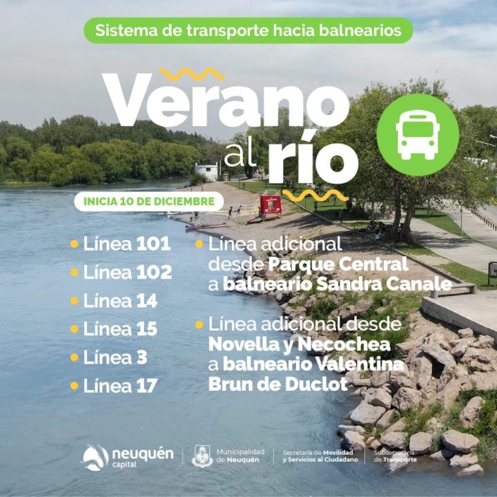 Las nuevas lineas que comenzaron a circular son «verano en el río» que une el centro con los balnearios del sur, y la linea «balneario Valentina Sur» que conecta el oeste de Neuquén con el suroeste. En el caso de la primer linea, cuenta con dos unidades que harán los recorridos con frecuencias cada media hora transitando por: Olascoaga, La Pampa, Aconcagua, balneario Gustavo Fahler (Río Grande), Leguizamón, Río Senguer, Gatica, llegando al ingreso del balneario Sandra Canale (Gatica).