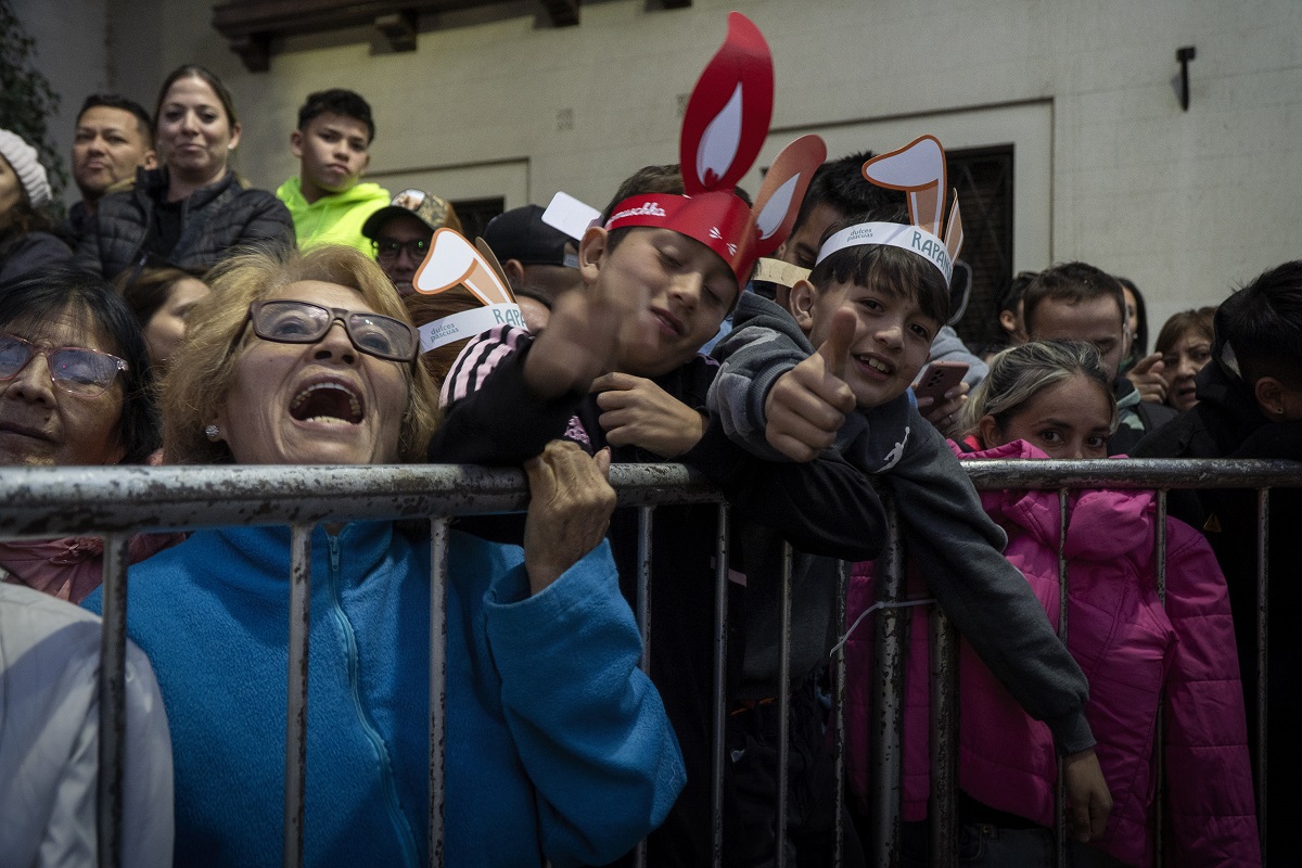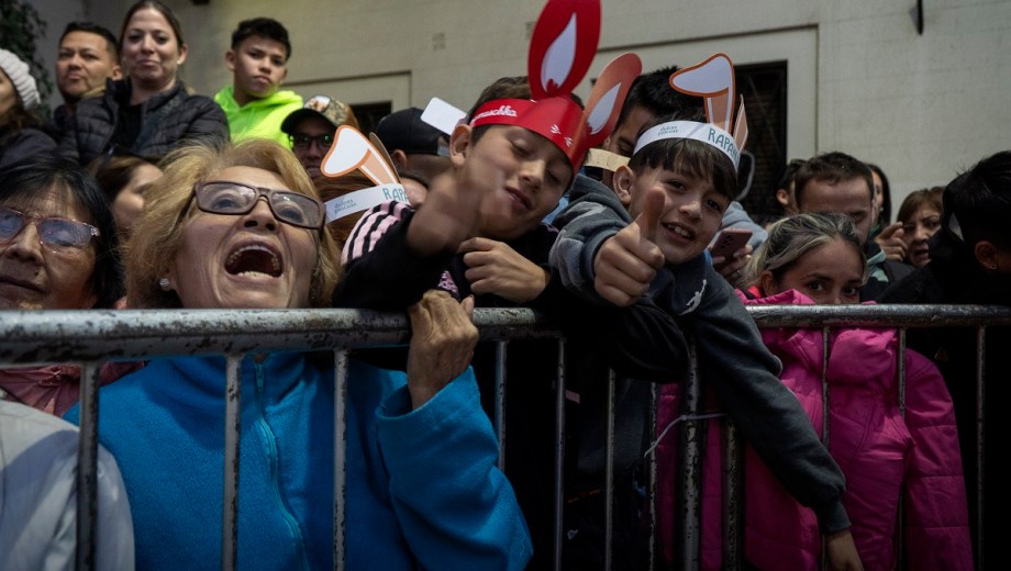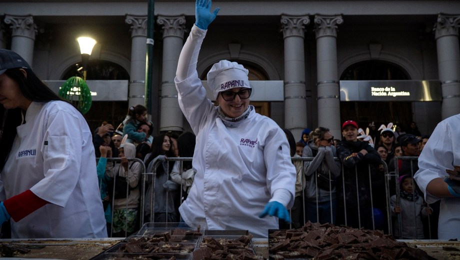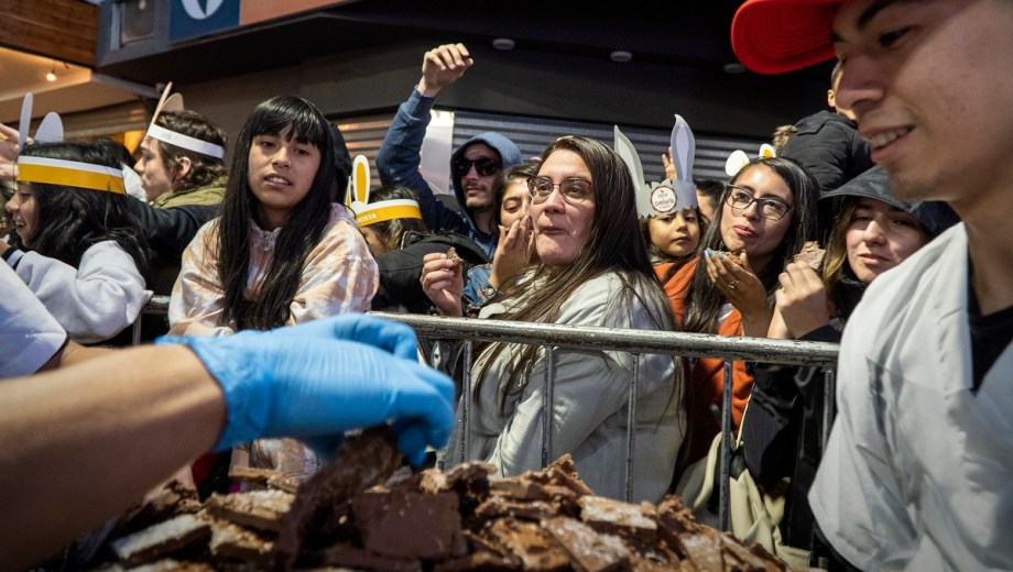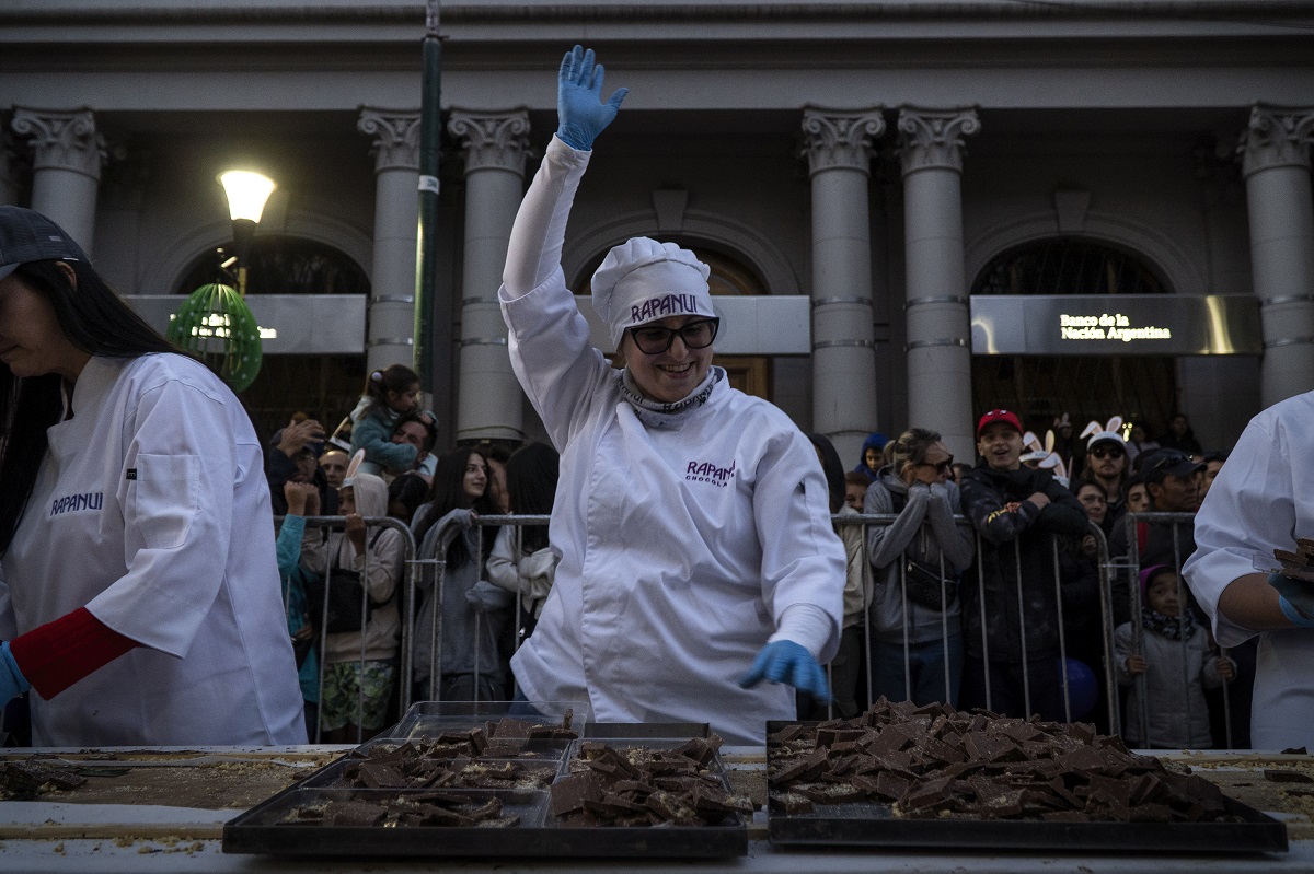 Unas tres horas antes de la convocatoria, la gente ya empezó a ubicarse detrás de las vallas que rodeaban el molde gigante para asegurarse un buen lugar. Recién a las 18.45, un conejo de Pascuas encabezó la entrada de los 200 maestros chocolateros al Paseo del Chocolate. Media hora después, esparcían el cacao.
