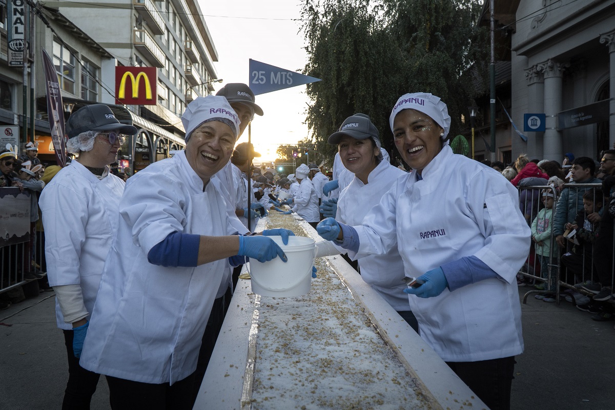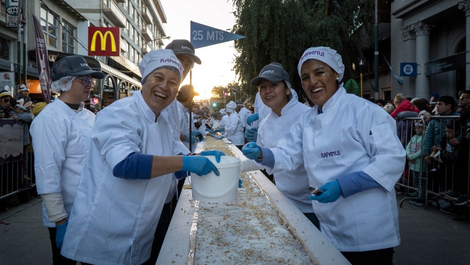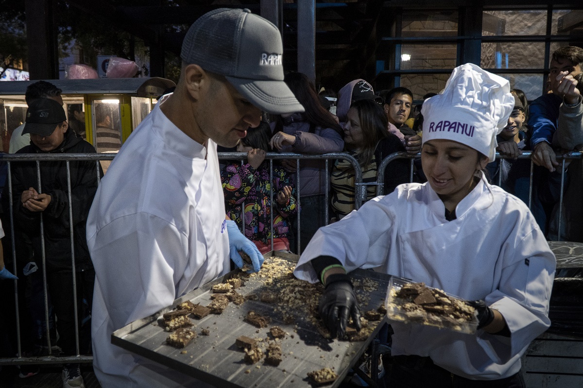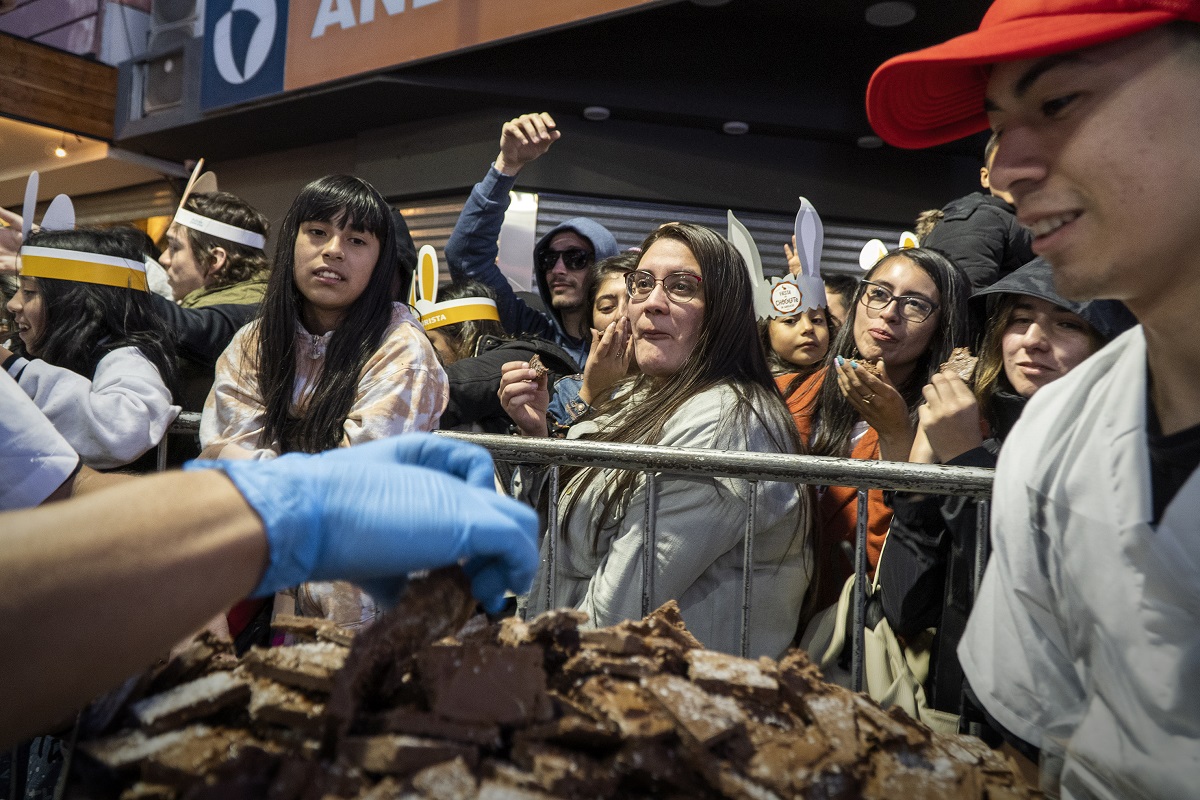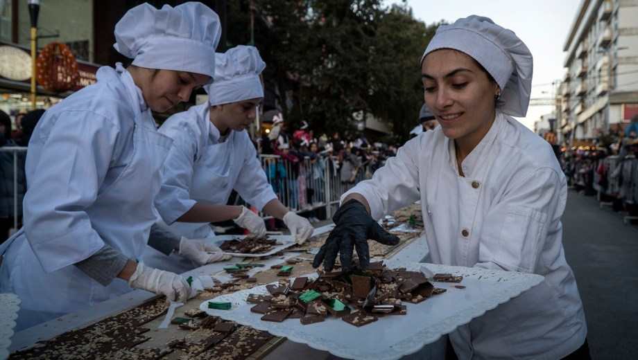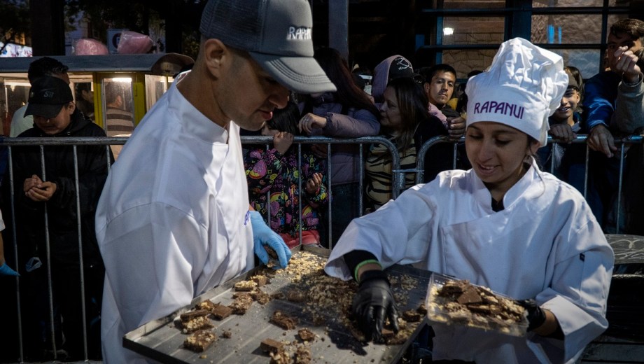 «El chocolate se cristaliza en algunos minutos y cuando está solidificado se corta en pequeñas porciones«, contó el conductor del evento a la gente. Había turistas de Neuquén, General Roca, Comodoro Rivadavia, Ushuaia, Buneos Aires, Chile y Uruguay, entre tantos otros. Un nene no paraba de gritar: «¡Repartan chocolate!».