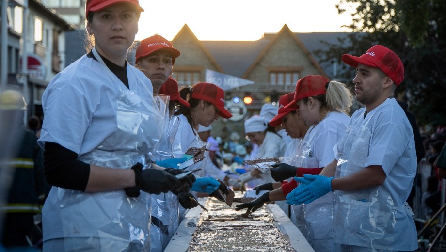 Más de 200 maestros chocolateros participaron en el armado de la barra de 218 metros. Pasadas las 19 se empezó a fraccionar para los presentes.
