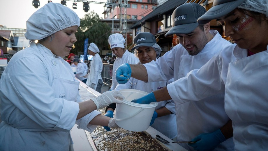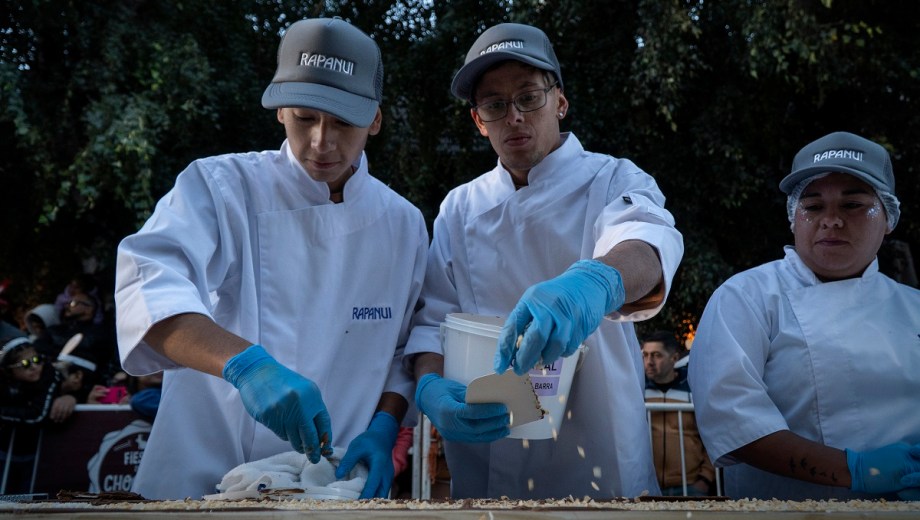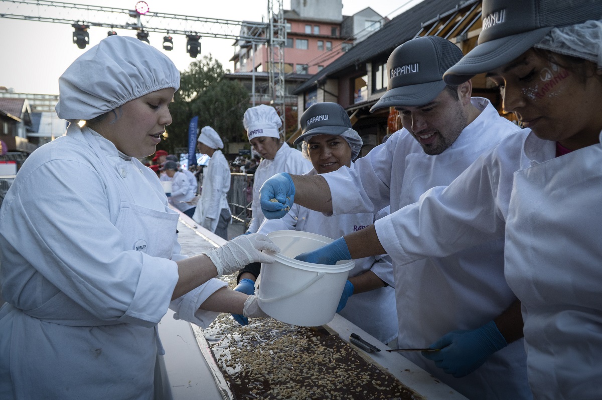 La nueva edición de la Fiesta Nacional del Chocolate aportó, una vez más, uno de sus espectáculos más convocantes en Bariloche: la barra de chocolate más larga del mundo que se elabora en vivo y en directo.