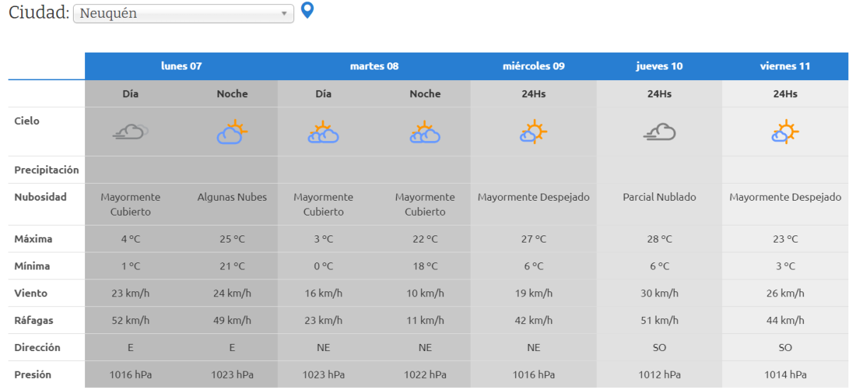 En Neuquén, el lunes y el martes se esperan mínimas de 0°C y una máxima de 28° C el jueves. El 10 de octubre se espera una jornada ventosa con ráfagas de 51 km/h.