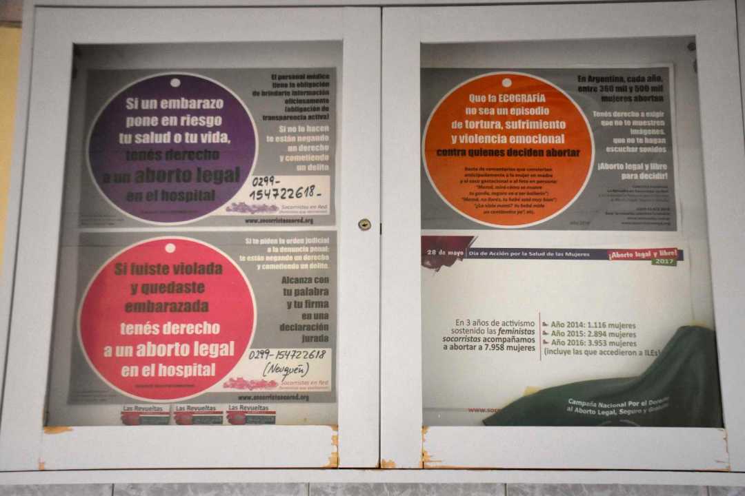La única referencia que hay en el hospital de mayor complejidad de la provincia está en las dos vitrinas informativas de madera que instaló la Colectiva Feminista La Revuelta, en coordinación con el personal, tanto en la entrada por calle Buenos Aires, a mano derecha, y en ginecología, donde conserva un pañuelo verde.