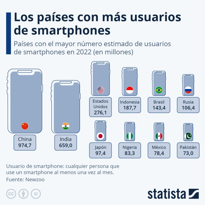 Según Statista, China, India y Estados Unidos son los países con mayor uso de smartphones en el mundo. Según el mismo centro de estadísticas, las personas pasan más de tres horas diarias en el celular. En un mes el número equivale a 84 horas y 1095 horas en un año, es decir, un equivalente a 46 días del año usando el celular.