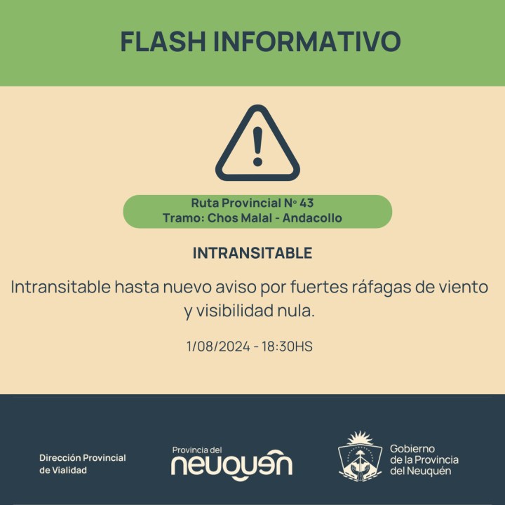 Por otra parte, desde Vialidad provincial detallaron que la Ruta 43 entre Chos Malal y Andacollo se encuentra intransitable hasta nuevo aviso por fuertes ráfagas de viento.