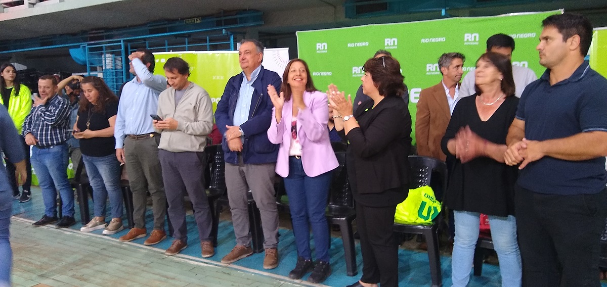 La gobernadora Arabela Carreras presidió el acto, rodeada por ministros y funcionarios, además del intendente anfitrión Gustavo Gennuso y su par de Dina Huapi, Mónica Balseiro, en una ceremonia animada por la juventud.